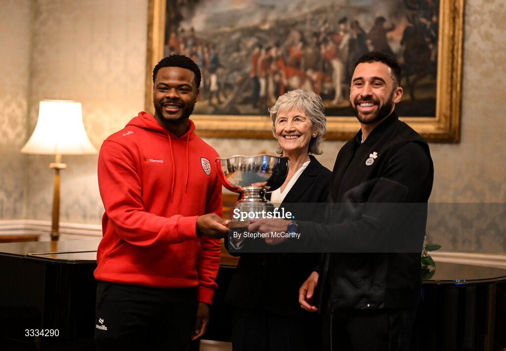 29 January 2026; The President of Ireland Catherine Connolly receives FAI President's Cup representatives Derry City's Dipo Akinyemi and Shamrock Rovers captain Roberto Lopes, right, at Áras an Uachtaráin in Dublin. On Saturday 31st January, last season’s SSE Airtricity Men’s Premier Division and Sports Direct FAI Men’s Cup winers Shamrock Rovers will play SSE Airtricity Men’s Premier Division runners-up Derry City at Tallaght Stadium. On Sunday 8th March, 2025 SSE Airtricity Women’s Premier Division and Sports Direct FAI Women's Cup winners Athlone Town will play the SSE Airtricity Women’s Premier Division runners-up Shelbourne at Athlone Town Stadium. Photo by Stephen McCarthy/Sportsfile