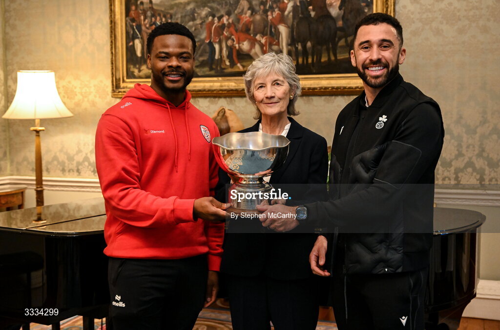 29 January 2026; The President of Ireland Catherine Connolly receives FAI President's Cup representatives Derry City's Dipo Akinyemi and Shamrock Rovers captain Roberto Lopes, right, at Áras an Uachtaráin in Dublin. On Saturday 31st January, last season’s SSE Airtricity Men’s Premier Division and Sports Direct FAI Men’s Cup winers Shamrock Rovers will play SSE Airtricity Men’s Premier Division runners-up Derry City at Tallaght Stadium. On Sunday 8th March, 2025 SSE Airtricity Women’s Premier Division and Sports Direct FAI Women's Cup winners Athlone Town will play the SSE Airtricity Women’s Premier Division runners-up Shelbourne at Athlone Town Stadium. Photo by Stephen McCarthy/Sportsfile