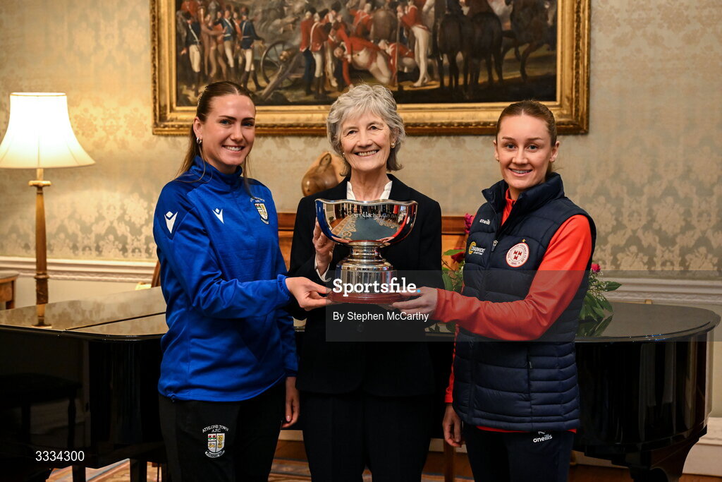 29 January 2026; The President of Ireland Catherine Connolly receives FAI President's Cup representatives Athlone Town's Maddie Gibson, left, and Shelbourne's Rachel Graham at Áras an Uachtaráin in Dublin. On Saturday 31st January, last season’s SSE Airtricity Men’s Premier Division and Sports Direct FAI Men’s Cup winers Shamrock Rovers will play SSE Airtricity Men’s Premier Division runners-up Derry City at Tallaght Stadium. On Sunday 8th March, 2025 SSE Airtricity Women’s Premier Division and Sports Direct FAI Women's Cup winners Athlone Town will play the SSE Airtricity Women’s Premier Division runners-up Shelbourne at Athlone Town Stadium. Photo by Stephen McCarthy/Sportsfile