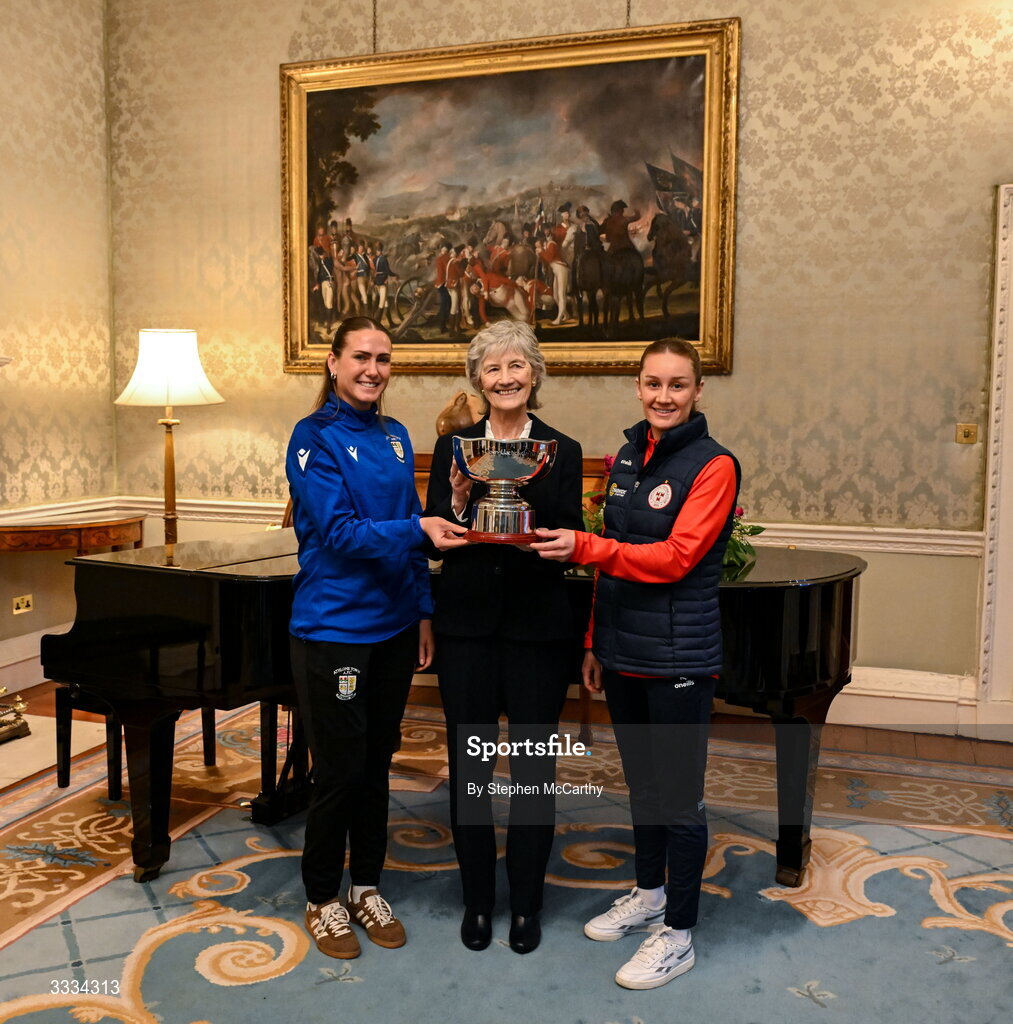 29 January 2026; The President of Ireland Catherine Connolly receives FAI President's Cup representatives, from left, Athlone Town's Maddie Gibson and Shelbourne's Rachel Graham, right, at Áras an Uachtaráin in Dublin. On Saturday 31st January, last season’s SSE Airtricity Men’s Premier Division and Sports Direct FAI Men’s Cup winers Shamrock Rovers will play SSE Airtricity Men’s Premier Division runners-up Derry City at Tallaght Stadium. On Sunday 8th March, 2025 SSE Airtricity Women’s Premier Division and Sports Direct FAI Women's Cup winners Athlone Town will play the SSE Airtricity Women’s Premier Division runners-up Shelbourne at Athlone Town Stadium. Photo by Stephen McCarthy/Sportsfile