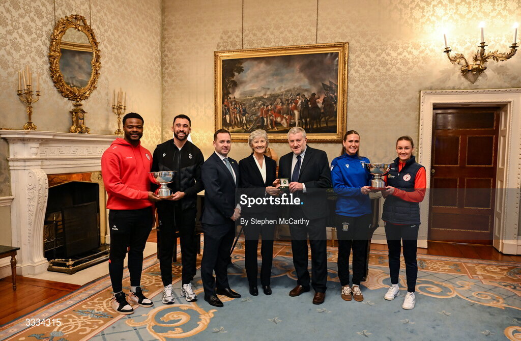 29 January 2026; The President of Ireland Catherine Connolly receives FAI President's Cup representatives, from left, Derry City's Dipo Akinyemi, Shamrock Rovers captain Roberto Lopes, League of Ireland director Mark Scanlon, FAI president Paul Cooke, Athlone Town's Maddie Gibson and Shelbourne's Rachel Graham at Áras an Uachtaráin in Dublin. On Saturday 31st January, last season’s SSE Airtricity Men’s Premier Division and Sports Direct FAI Men’s Cup winers Shamrock Rovers will play SSE Airtricity Men’s Premier Division runners-up Derry City at Tallaght Stadium. On Sunday 8th March, 2025 SSE Airtricity Women’s Premier Division and Sports Direct FAI Women's Cup winners Athlone Town will play the SSE Airtricity Women’s Premier Division runners-up Shelbourne at Athlone Town Stadium. Photo by Stephen McCarthy/Sportsfile