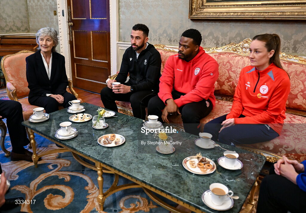 29 January 2026; The President of Ireland Catherine Connolly receives FAI President's Cup representatives, from left, Shamrock Rovers captain Roberto Lopes, Derry City's Dipo Akinyemi and Shelbourne's Rachel Graham at Áras an Uachtaráin in Dublin. On Saturday 31st January, last season’s SSE Airtricity Men’s Premier Division and Sports Direct FAI Men’s Cup winers Shamrock Rovers will play SSE Airtricity Men’s Premier Division runners-up Derry City at Tallaght Stadium. On Sunday 8th March, 2025 SSE Airtricity Women’s Premier Division and Sports Direct FAI Women's Cup winners Athlone Town will play the SSE Airtricity Women’s Premier Division runners-up Shelbourne at Athlone Town Stadium. Photo by Stephen McCarthy/Sportsfile