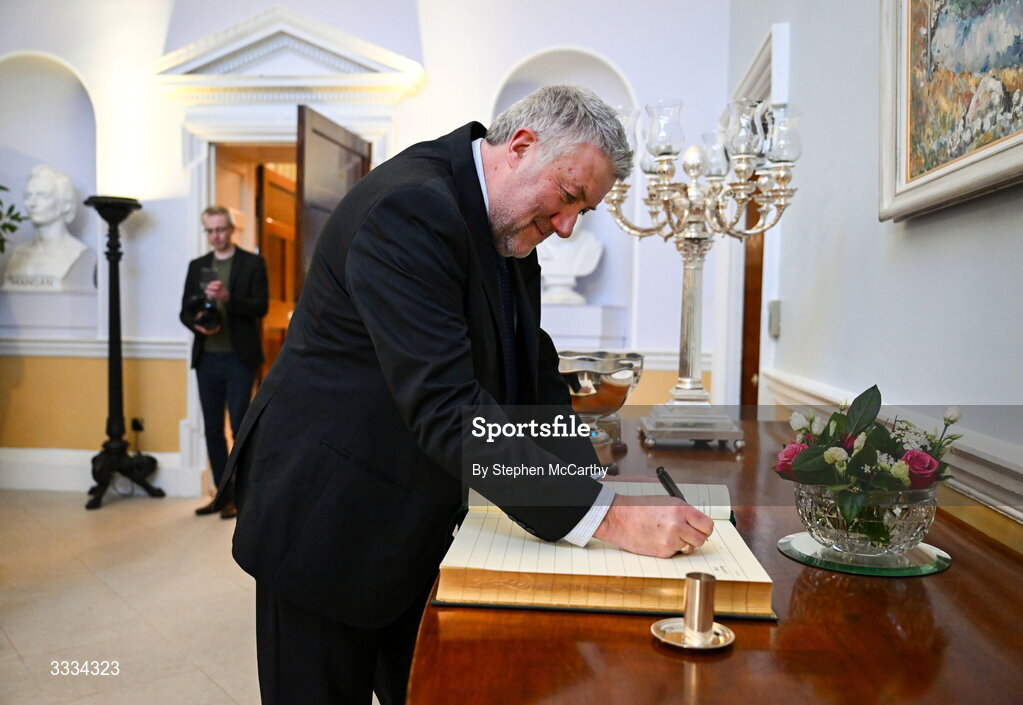 29 January 2026; FAI president Paul Cooke signs the guest book on arrival for The President of Ireland Catherine Connolly to receive FAI President's Cup representatives at Áras an Uachtaráin in Dublin. On Saturday 31st January, last season’s SSE Airtricity Men’s Premier Division and Sports Direct FAI Men’s Cup winers Shamrock Rovers will play SSE Airtricity Men’s Premier Division runners-up Derry City at Tallaght Stadium. On Sunday 8th March, 2025 SSE Airtricity Women’s Premier Division and Sports Direct FAI Women's Cup winners Athlone Town will play the SSE Airtricity Women’s Premier Division runners-up Shelbourne at Athlone Town Stadium. Photo by Stephen McCarthy/Sportsfile