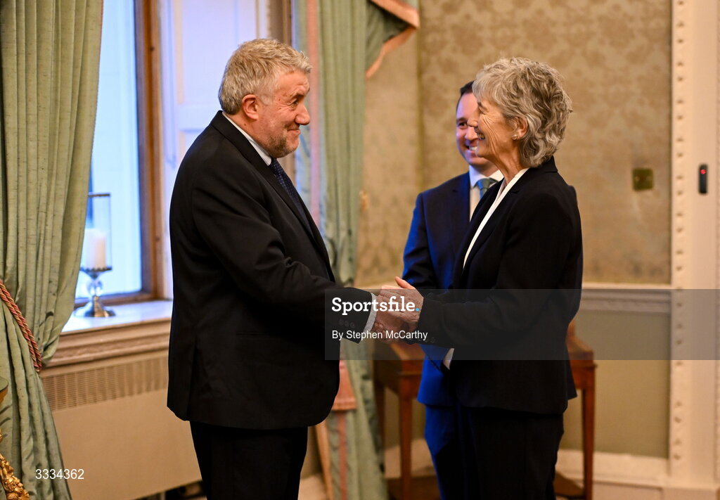 29 January 2026; The President of Ireland Catherine Connolly receives FAI president Paul Cooke at Áras an Uachtaráin in Dublin. On Saturday 31st January, last season’s SSE Airtricity Men’s Premier Division and Sports Direct FAI Men’s Cup winers Shamrock Rovers will play SSE Airtricity Men’s Premier Division runners-up Derry City at Tallaght Stadium. On Sunday 8th March, 2025 SSE Airtricity Women’s Premier Division and Sports Direct FAI Women's Cup winners Athlone Town will play the SSE Airtricity Women’s Premier Division runners-up Shelbourne at Athlone Town Stadium. Photo by Stephen McCarthy/Sportsfile
