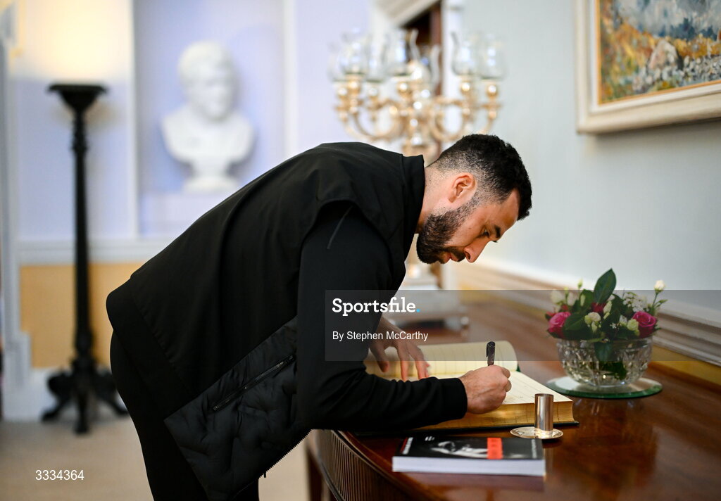29 January 2026; Shamrock Rovers captain Roberto Lopes signs the guest book on arrival for The President of Ireland Catherine Connolly to receive FAI President's Cup representatives at Áras an Uachtaráin in Dublin. On Saturday 31st January, last season’s SSE Airtricity Men’s Premier Division and Sports Direct FAI Men’s Cup winers Shamrock Rovers will play SSE Airtricity Men’s Premier Division runners-up Derry City at Tallaght Stadium. On Sunday 8th March, 2025 SSE Airtricity Women’s Premier Division and Sports Direct FAI Women's Cup winners Athlone Town will play the SSE Airtricity Women’s Premier Division runners-up Shelbourne at Athlone Town Stadium. Photo by Stephen McCarthy/Sportsfile