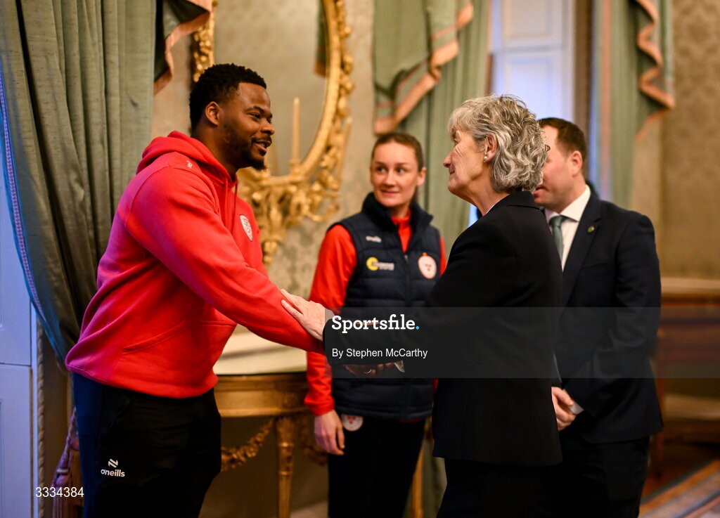 29 January 2026; The President of Ireland Catherine Connolly receives FAI President's Cup representative Derry City's Dipo Akinyemi at Áras an Uachtaráin in Dublin. On Saturday 31st January, last season’s SSE Airtricity Men’s Premier Division and Sports Direct FAI Men’s Cup winers Shamrock Rovers will play SSE Airtricity Men’s Premier Division runners-up Derry City at Tallaght Stadium. On Sunday 8th March, 2025 SSE Airtricity Women’s Premier Division and Sports Direct FAI Women's Cup winners Athlone Town will play the SSE Airtricity Women’s Premier Division runners-up Shelbourne at Athlone Town Stadium. Photo by Stephen McCarthy/Sportsfile