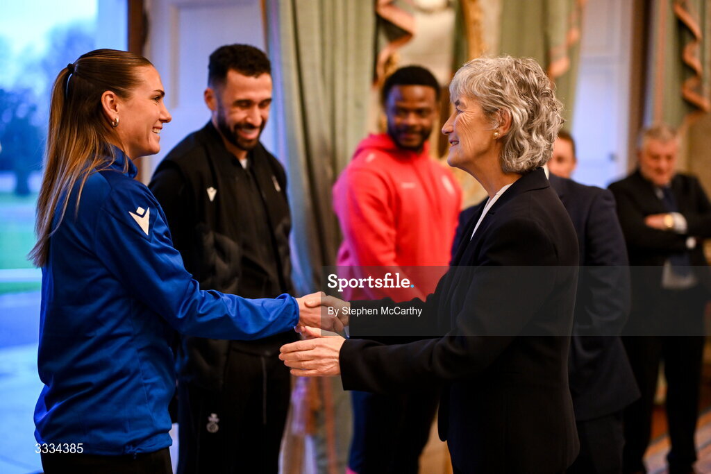 29 January 2026; The President of Ireland Catherine Connolly receives FAI President's Cup representative Athlone Town's Maddie Gibson at Áras an Uachtaráin in Dublin. On Saturday 31st January, last season’s SSE Airtricity Men’s Premier Division and Sports Direct FAI Men’s Cup winers Shamrock Rovers will play SSE Airtricity Men’s Premier Division runners-up Derry City at Tallaght Stadium. On Sunday 8th March, 2025 SSE Airtricity Women’s Premier Division and Sports Direct FAI Women's Cup winners Athlone Town will play the SSE Airtricity Women’s Premier Division runners-up Shelbourne at Athlone Town Stadium. Photo by Stephen McCarthy/Sportsfile