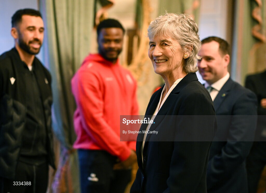 29 January 2026; The President of Ireland Catherine Connolly during a reception for FAI President's Cup representatives at Áras an Uachtaráin in Dublin. On Saturday 31st January, last season’s SSE Airtricity Men’s Premier Division and Sports Direct FAI Men’s Cup winers Shamrock Rovers will play SSE Airtricity Men’s Premier Division runners-up Derry City at Tallaght Stadium. On Sunday 8th March, 2025 SSE Airtricity Women’s Premier Division and Sports Direct FAI Women's Cup winners Athlone Town will play the SSE Airtricity Women’s Premier Division runners-up Shelbourne at Athlone Town Stadium. Photo by Stephen McCarthy/Sportsfile