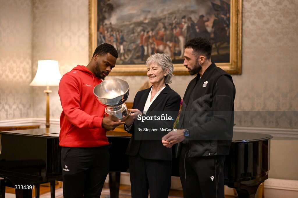 29 January 2026; The President of Ireland Catherine Connolly receives FAI President's Cup representatives Derry City's Dipo Akinyemi, left, and Shamrock Rovers captain Roberto Lopes at Áras an Uachtaráin in Dublin. On Saturday 31st January, last season’s SSE Airtricity Men’s Premier Division and Sports Direct FAI Men’s Cup winers Shamrock Rovers will play SSE Airtricity Men’s Premier Division runners-up Derry City at Tallaght Stadium. On Sunday 8th March, 2025 SSE Airtricity Women’s Premier Division and Sports Direct FAI Women's Cup winners Athlone Town will play the SSE Airtricity Women’s Premier Division runners-up Shelbourne at Athlone Town Stadium. Photo by Stephen McCarthy/Sportsfile