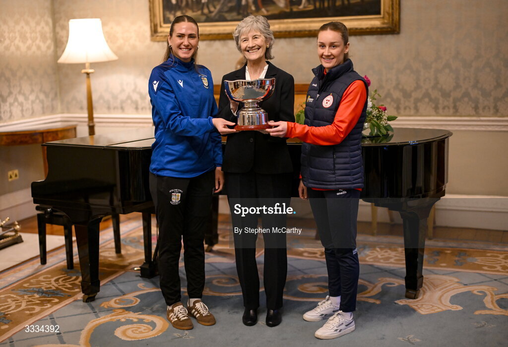 29 January 2026; The President of Ireland Catherine Connolly receives FAI President's Cup representatives Athlone Town's Maddie Gibson, left, and Shelbourne's Rachel Graham at Áras an Uachtaráin in Dublin. On Saturday 31st January, last season’s SSE Airtricity Men’s Premier Division and Sports Direct FAI Men’s Cup winers Shamrock Rovers will play SSE Airtricity Men’s Premier Division runners-up Derry City at Tallaght Stadium. On Sunday 8th March, 2025 SSE Airtricity Women’s Premier Division and Sports Direct FAI Women's Cup winners Athlone Town will play the SSE Airtricity Women’s Premier Division runners-up Shelbourne at Athlone Town Stadium. Photo by Stephen McCarthy/Sportsfile
