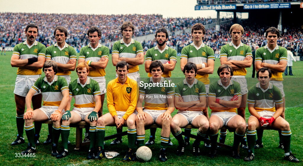 31 July 1983; Offaly team, from left, Sean Lowry, Gerry Carroll, Johnny Mooney, Liam O'Connor, Liam Currams, Padraig Dunne, Thomas O'Connor and Matt Connor, with, front, from left, Mick Fitzgerald, Pat Fitzgerald, Martin Furlong, Richie Connor, John Guinan, Brendan Lowry and Charlie Conroy before the Leinster Senior Football Championship final between Dublin and Offaly at Croke Park in Dublin. Photo by Ray McManus/Sportsfile