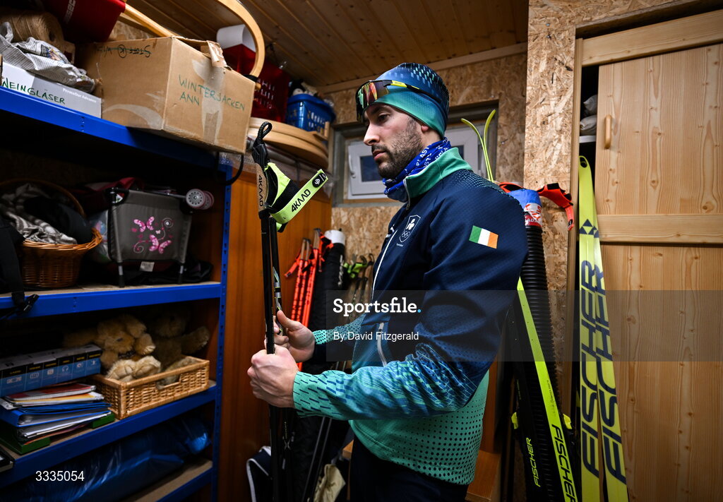 30 January 2026; Thomas Maloney Westgaard of Team Ireland gathers his skis before competing in a test race ahead of the Milano Cortina 2026 Winter Olympics in Seefeld, Austria. Photo by David Fitzgerald/Sportsfile