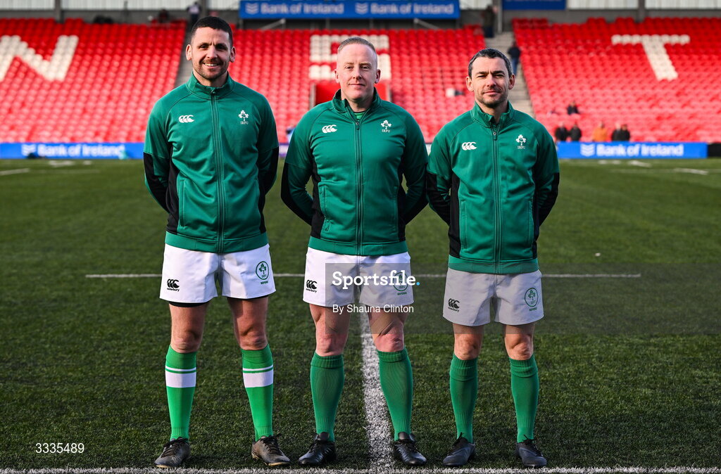 25 January 2026; Referee Paudie Sheehan, centre, with match officials Fergal Brislane, left, and Michael Reidy before the Celtic Challenge Round 5 match between Clovers and Brython Thunder at Virgin Media Park in Cork. Photo by Shauna Clinton/Sportsfile
