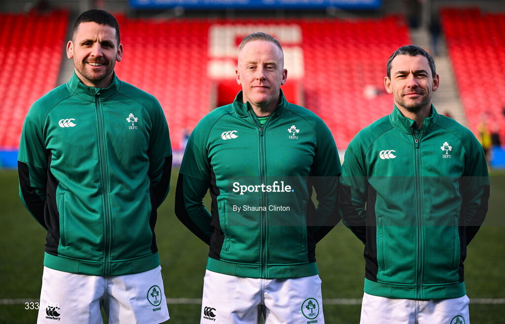 25 January 2026; Referee Paudie Sheehan, centre, with match officials Fergal Brislane, left, and Michael Reidy before the Celtic Challenge Round 5 match between Clovers and Brython Thunder at Virgin Media Park in Cork. Photo by Shauna Clinton/Sportsfile