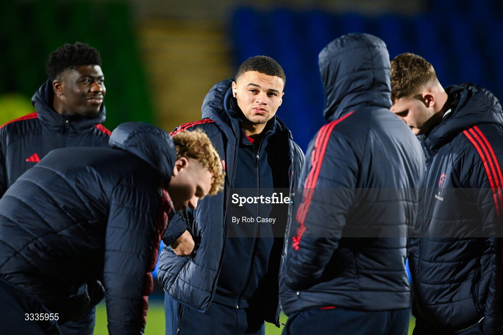 30 January 2026; Shay McCarthy of Munster, centre, with teammates before the United Rugby Championship match between Glasgow Warriors and Munster at Scotstoun Stadium in Glasgow, Scotland. Photo by Rob Casey/Sportsfile