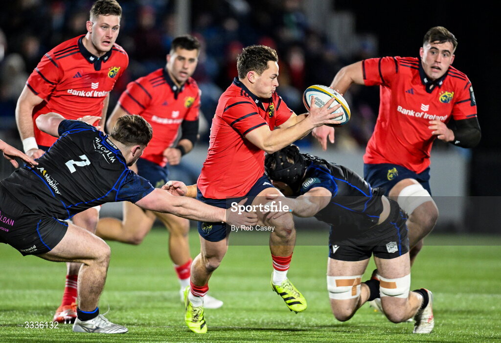 30 January 2026; Tony Butler of Munster is tackled by Seb Stephen of Glasgow Warriors, left, during the United Rugby Championship match between Glasgow Warriors and Munster at Scotstoun Stadium in Glasgow, Scotland. Photo by Rob Casey/Sportsfile