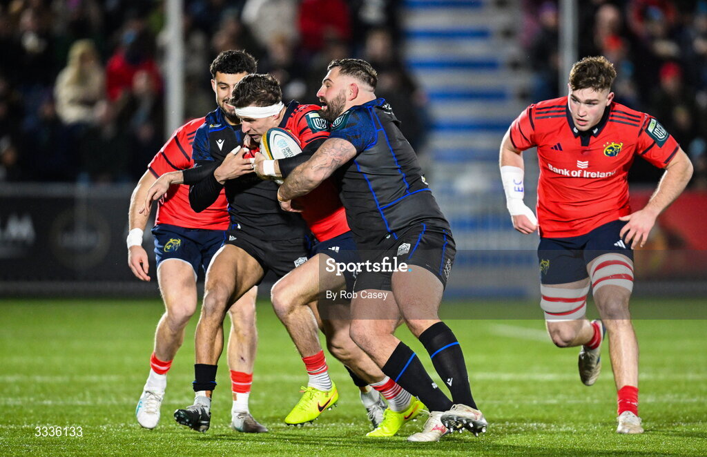 30 January 2026; Shane Daly of Munster is tackled by Jamie Bhatti of Glasgow Warriors, right, during the United Rugby Championship match between Glasgow Warriors and Munster at Scotstoun Stadium in Glasgow, Scotland. Photo by Rob Casey/Sportsfile
