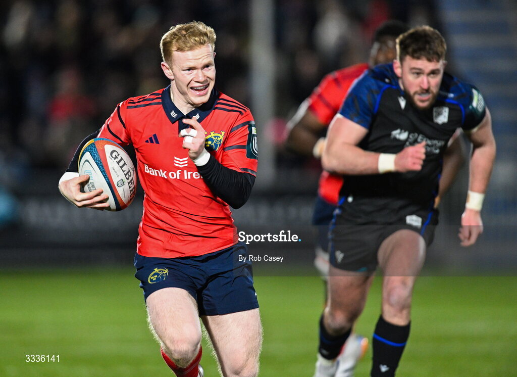 30 January 2026; Ethan Coughlan of Munster intercepts a pass on the way to scoring a try during the United Rugby Championship match between Glasgow Warriors and Munster at Scotstoun Stadium in Glasgow, Scotland. Photo by Rob Casey/Sportsfile