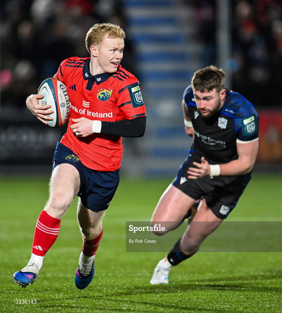 30 January 2026; Ethan Coughlan of Munster intercepts a pass on the way to scoring a try during the United Rugby Championship match between Glasgow Warriors and Munster at Scotstoun Stadium in Glasgow, Scotland. Photo by Rob Casey/Sportsfile