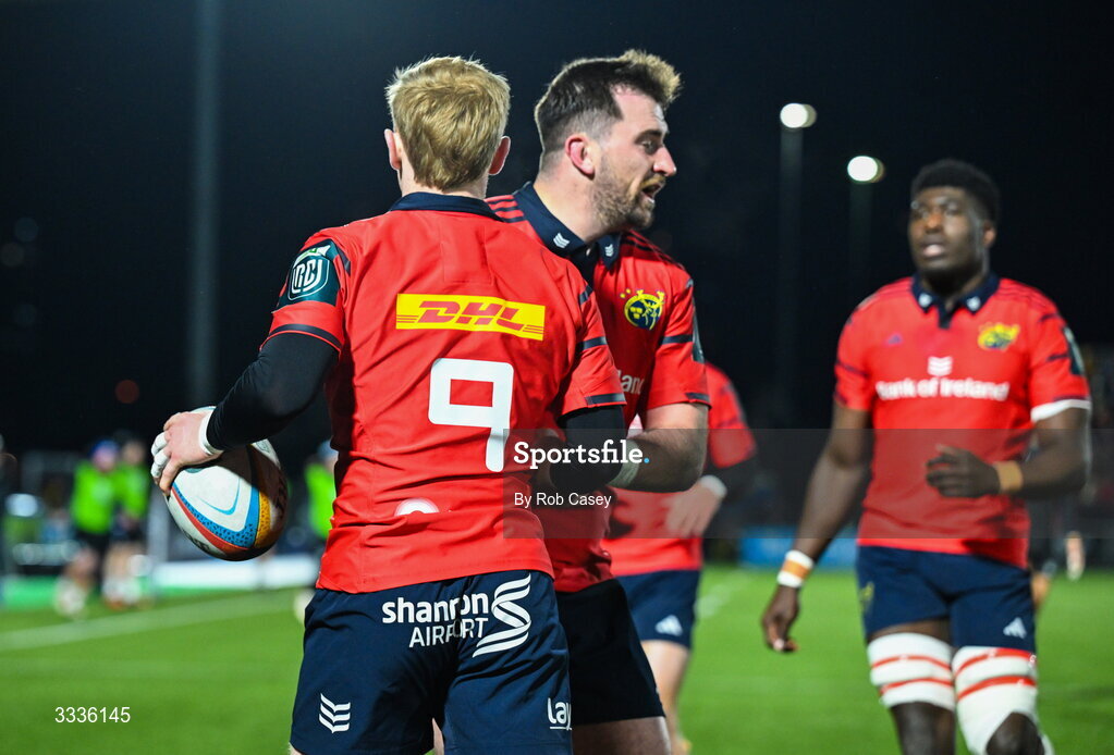 30 January 2026; Ethan Coughlin of Munster, 9, celebrates a try during the United Rugby Championship match between Glasgow Warriors and Munster at Scotstoun Stadium in Glasgow, Scotland. Photo by Rob Casey/Sportsfile