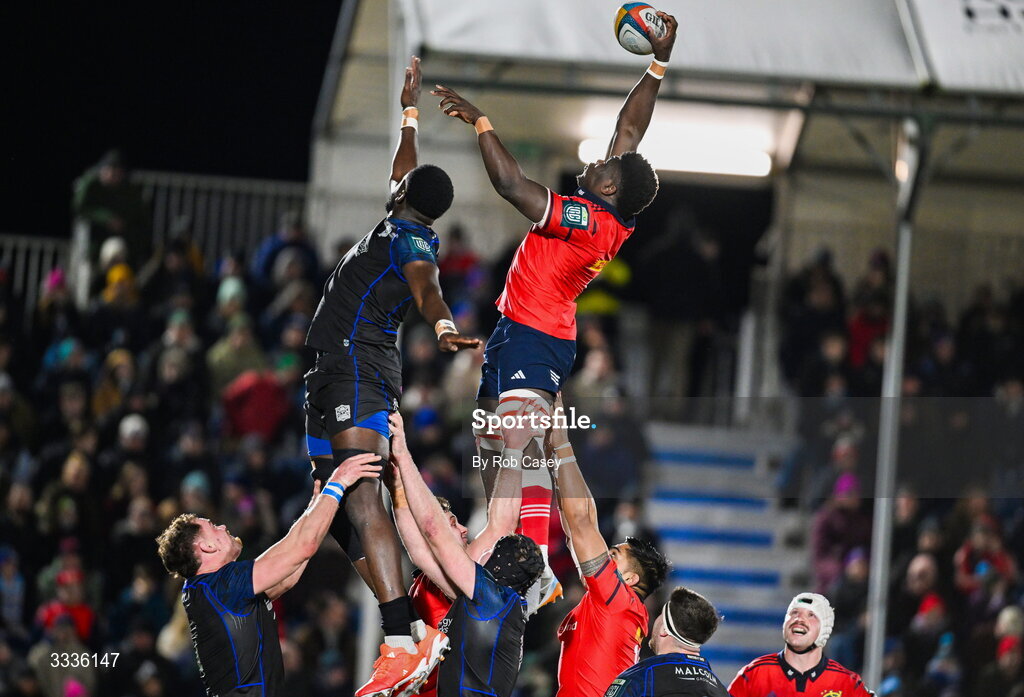 30 January 2026; Sean Edogbo of Munster takes the ball in a line-out during the United Rugby Championship match between Glasgow Warriors and Munster at Scotstoun Stadium in Glasgow, Scotland. Photo by Rob Casey/Sportsfile