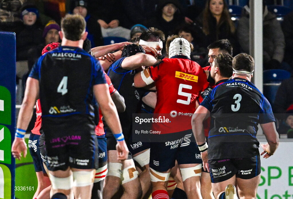30 January 2026; Players tussle during the United Rugby Championship match between Glasgow Warriors and Munster at Scotstoun Stadium in Glasgow, Scotland. Photo by Rob Casey/Sportsfile