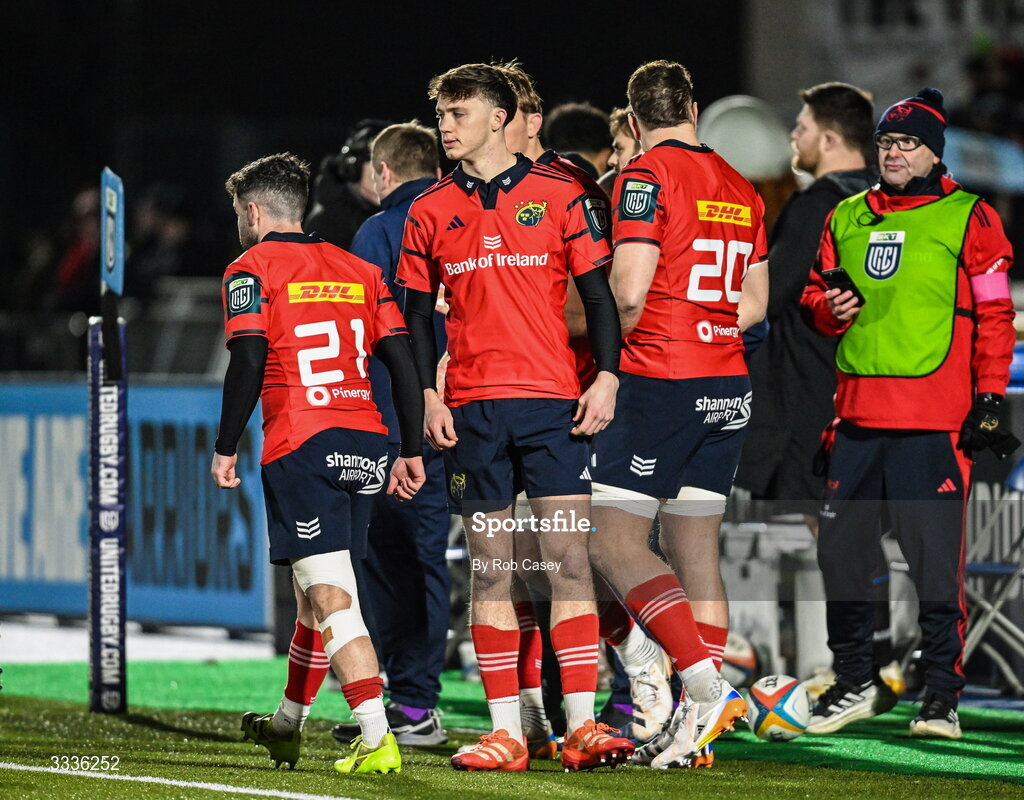 30 January 2026; Munster players. from left, Paddy Patterson, Tom Wood and Jack O'Donoghue come on as substitutes during the United Rugby Championship match between Glasgow Warriors and Munster at Scotstoun Stadium in Glasgow, Scotland. Photo by Rob Casey/Sportsfile