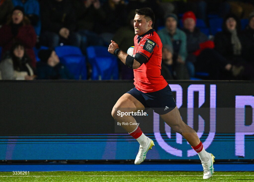 30 January 2026; Dan Kelly of Munster on his way to scoring a try during the United Rugby Championship match between Glasgow Warriors and Munster at Scotstoun Stadium in Glasgow, Scotland. Photo by Rob Casey/Sportsfile