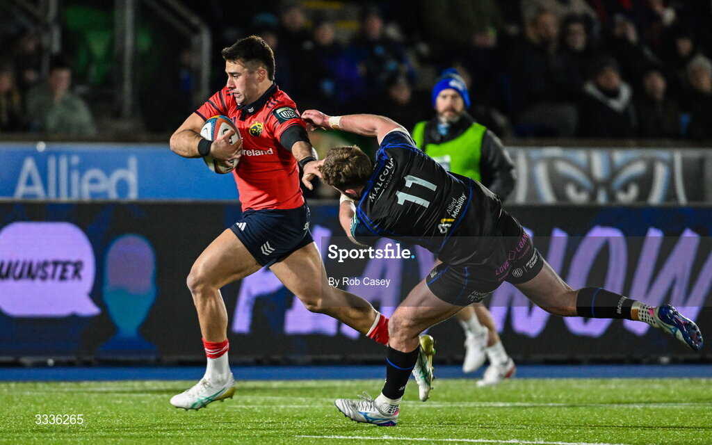 30 January 2026; Dan Kelly of Munster on his way to scoring a try despite the efforts of Ollie Smith of Glasgow Warriors during the United Rugby Championship match between Glasgow Warriors and Munster at Scotstoun Stadium in Glasgow, Scotland. Photo by Rob Casey/Sportsfile