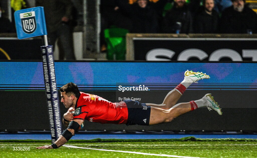 30 January 2026; Dan Kelly of Munster dives in to score a try during the United Rugby Championship match between Glasgow Warriors and Munster at Scotstoun Stadium in Glasgow, Scotland. Photo by Rob Casey/Sportsfile