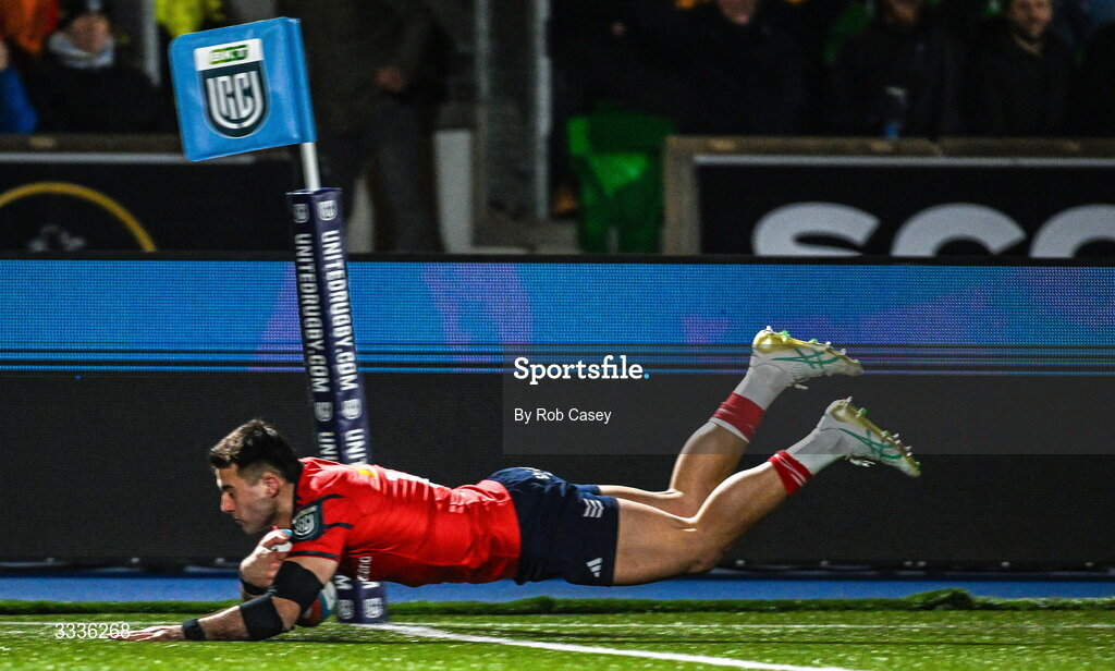 30 January 2026; Dan Kelly of Munster dives in to score a try during the United Rugby Championship match between Glasgow Warriors and Munster at Scotstoun Stadium in Glasgow, Scotland. Photo by Rob Casey/Sportsfile