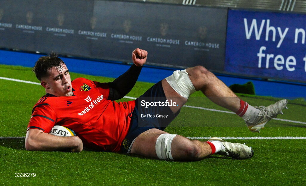 30 January 2026; Brian Gleeson of Munster scores a try during the United Rugby Championship match between Glasgow Warriors and Munster at Scotstoun Stadium in Glasgow, Scotland. Photo by Rob Casey/Sportsfile