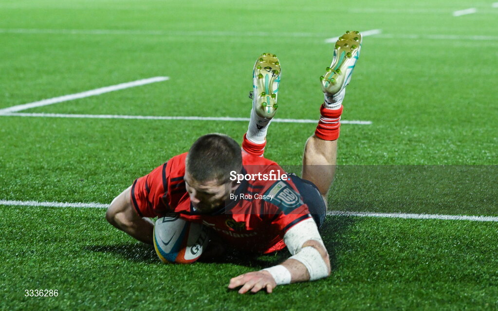 30 January 2026; Diarmuid Kilgallen of Munster scores a try during the United Rugby Championship match between Glasgow Warriors and Munster at Scotstoun Stadium in Glasgow, Scotland. Photo by Rob Casey/Sportsfile