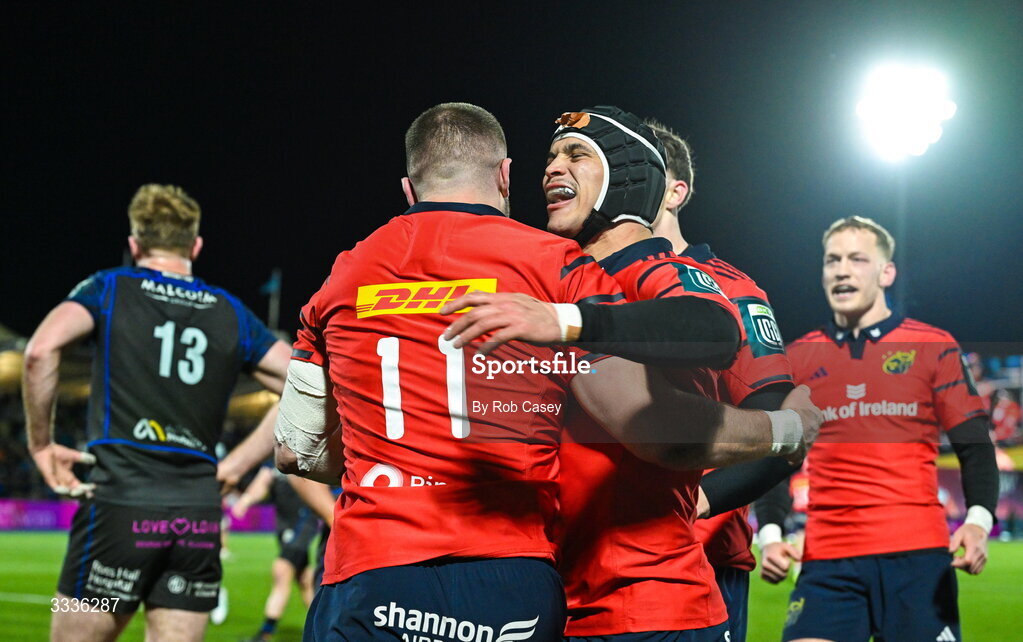 30 January 2026; Diarmuid Kilgallen of Munster, 11, celebrate with his teammate Thaakir Abrahams, after scoring a try during the United Rugby Championship match between Glasgow Warriors and Munster at Scotstoun Stadium in Glasgow, Scotland. Photo by Rob Casey/Sportsfile