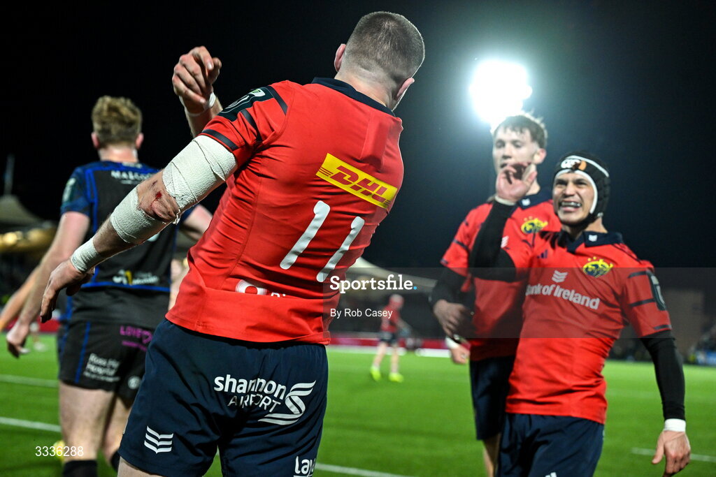 30 January 2026; Diarmuid Kilgallen of Munster, 11, celebrates with his teammate Thaakir Abrahams, after scoring a try during the United Rugby Championship match between Glasgow Warriors and Munster at Scotstoun Stadium in Glasgow, Scotland. Photo by Rob Casey/Sportsfile