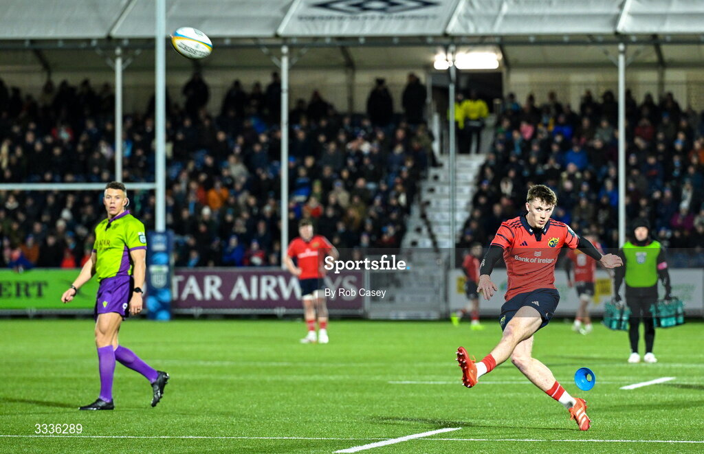30 January 2026; Tom Wood of Munster kicks a conversion during the United Rugby Championship match between Glasgow Warriors and Munster at Scotstoun Stadium in Glasgow, Scotland. Photo by Rob Casey/Sportsfile