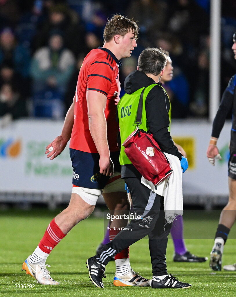 30 January 2026; Gavin Coombes of Munster leaves the pitch upon being substituted during the United Rugby Championship match between Glasgow Warriors and Munster at Scotstoun Stadium in Glasgow, Scotland. Photo by Rob Casey/Sportsfile