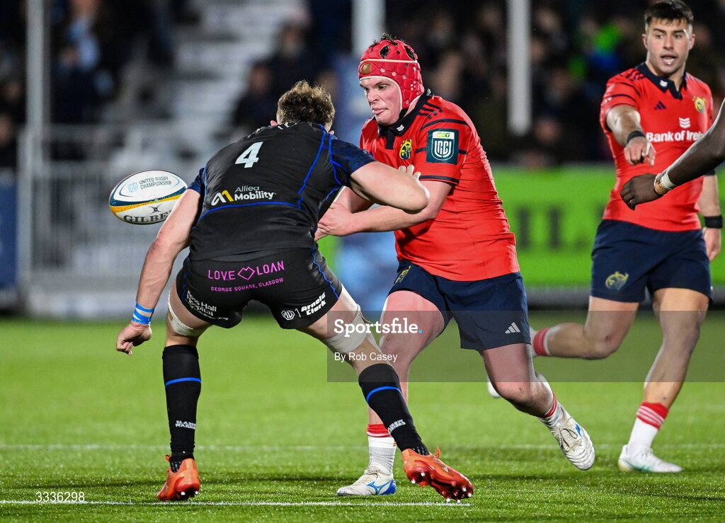 30 January 2026; Mark Donnelly of Munster in astion against Alex Craig of Glasgow Warriors during the United Rugby Championship match between Glasgow Warriors and Munster at Scotstoun Stadium in Glasgow, Scotland. Photo by Rob Casey/Sportsfile