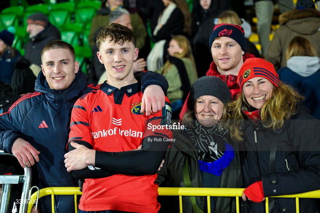 30 January 2026; Tom Wood of Munster with his family, from left, brothers Gordon and Alex and mother Nicola, right, after earning his first senior cap for Munster in the United Rugby Championship match between Glasgow Warriors and Munster at Scotstoun Stadium in Glasgow, Scotland. Photo by Rob Casey/Sportsfile