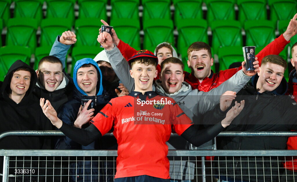 30 January 2026; Tom Wood of Munster with his friends after earning his first senior cap for Munster in the United Rugby Championship match between Glasgow Warriors and Munster at Scotstoun Stadium in Glasgow, Scotland. Photo by Rob Casey/Sportsfile