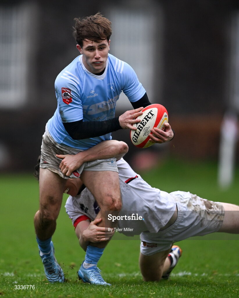 31 January 2026; Fionn Rowsome of Garryowen is tackled by Hugh Goddard of Dublin University during the Energia All-Ireland League Men’s Division 1B match between Dublin University and Garryowen at College Park in Dublin. Photo by Tyler Miller/Sportsfile