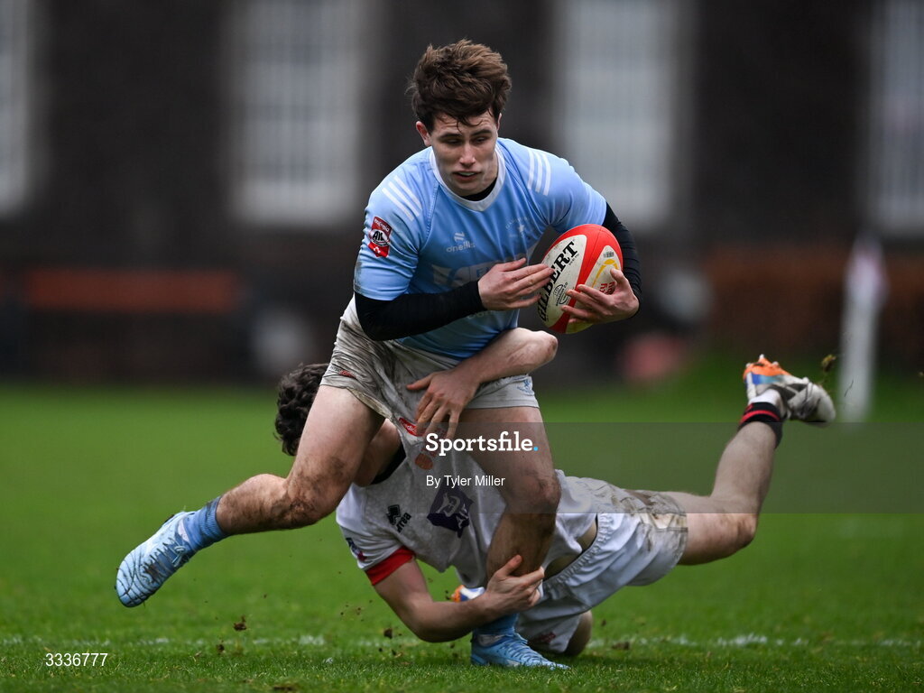 31 January 2026; Fionn Rowsome of Garryowen is tackled by Hugh Goddard of Dublin University during the Energia All-Ireland League Men’s Division 1B match between Dublin University and Garryowen at College Park in Dublin. Photo by Tyler Miller/Sportsfile
