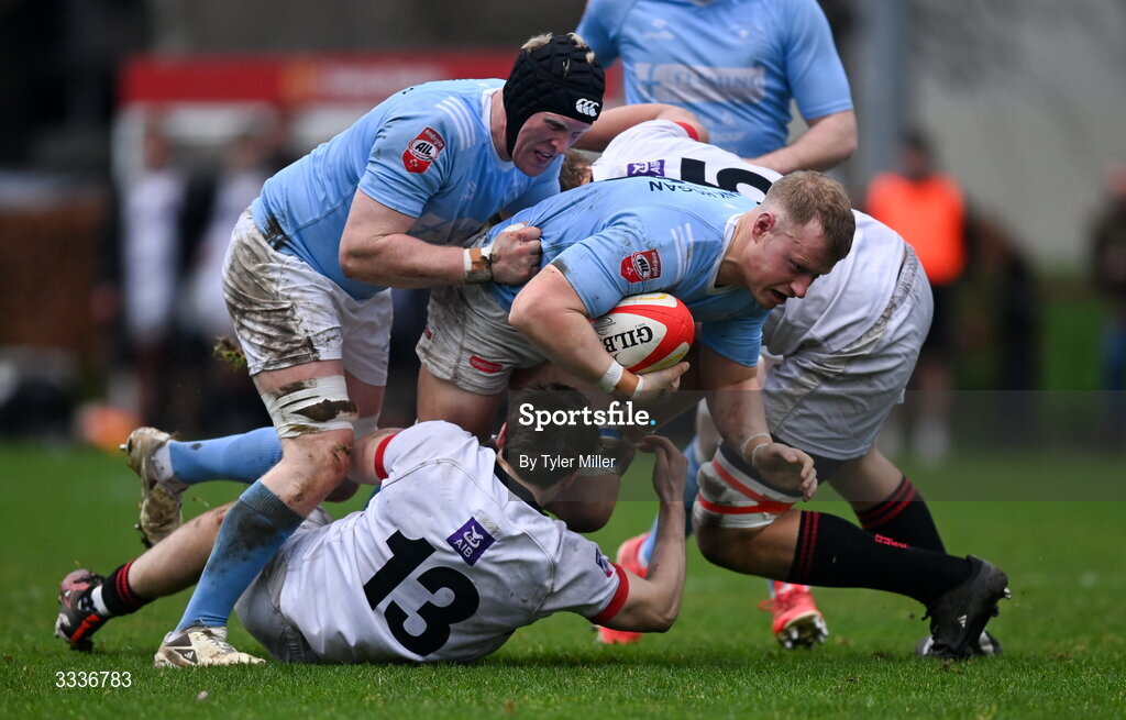 31 January 2026; Alan Fitzgerald of Garryowen is tackled by Hugo Lynch and Arthur Smykovskiy of Dublin University during the Energia All-Ireland League Men’s Division 1B match between Dublin University and Garryowen at College Park in Dublin. Photo by Tyler Miller/Sportsfile
