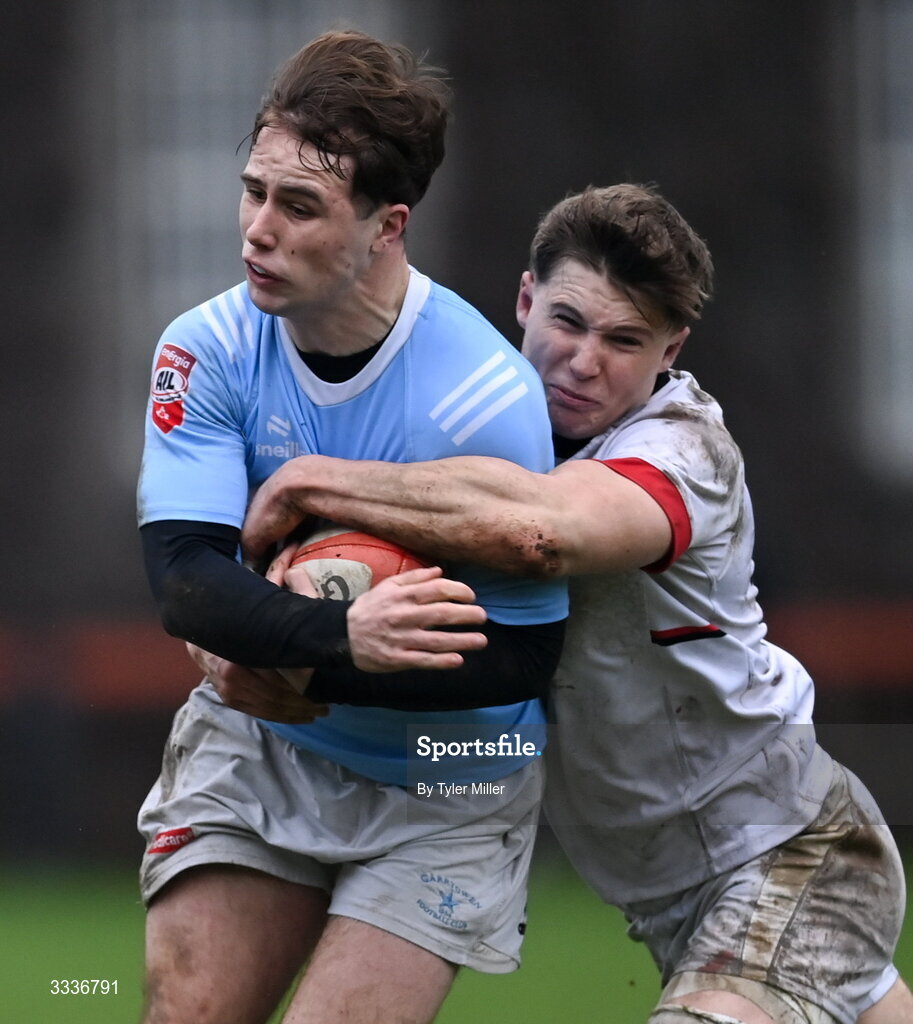 31 January 2026; Fionn Rowsome of Garryowen is tackled by Hugo Lynch of Dublin University during the Energia All-Ireland League Men’s Division 1B match between Dublin University and Garryowen at College Park in Dublin. Photo by Tyler Miller/Sportsfile