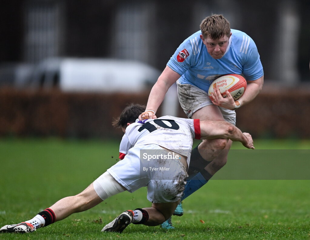 31 January 2026; Sean Rennison of Garryowen is tackled by Zach Quirke of Dublin University during the Energia All-Ireland League Men’s Division 1B match between Dublin University and Garryowen at College Park in Dublin. Photo by Tyler Miller/Sportsfile