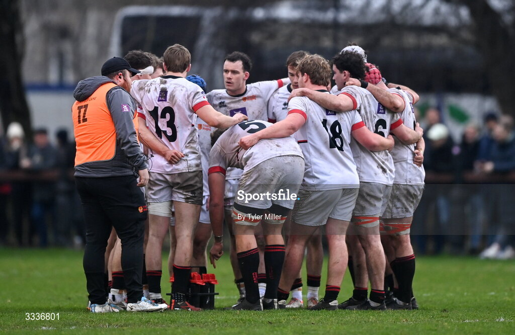 31 January 2026; The Dublin University team huddle during the Energia All-Ireland League Men’s Division 1B match between Dublin University and Garryowen at College Park in Dublin. Photo by Tyler Miller/Sportsfile