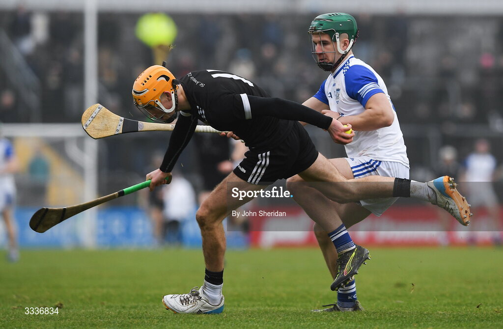 31 January 2026; Eoghan Doughan of Nenagh CBS in action against Darragh Ball of St Flannan's College Ennis during the Dr Harty Cup final match between St Flannans College and St Joseph's CBS at Zimmer Biomet Páirc Chíosóg in Ennis, Clare. Photo by John Sheridan/Sportsfile