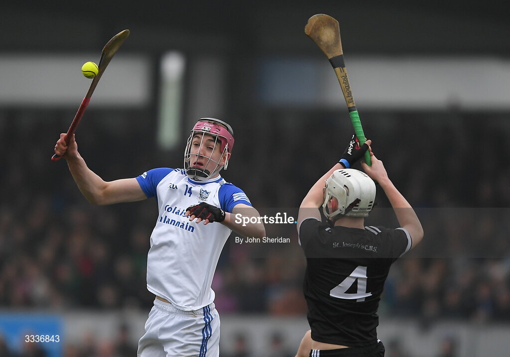 31 January 2026; Thomas O'Connor of St Flannan's College Ennis in action against Cormac Kennedy of Nenagh CBS during the Dr Harty Cup final match between St Flannans College and St Joseph's CBS at Zimmer Biomet Páirc Chíosóg in Ennis, Clare. Photo by John Sheridan/Sportsfile