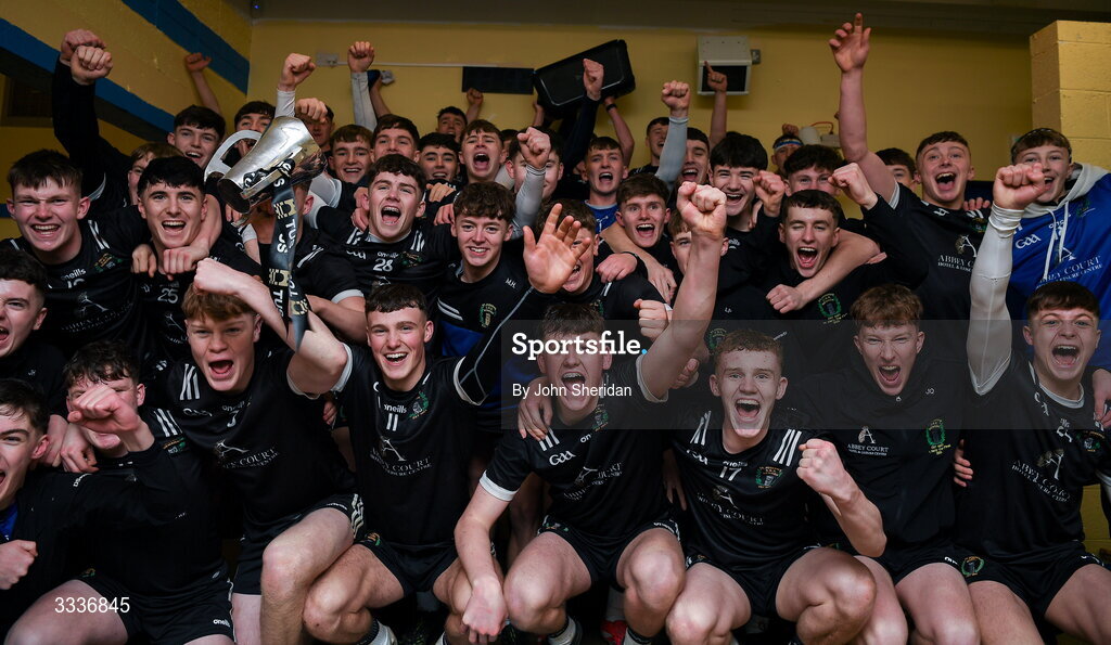 31 January 2026; The Nenagh players celebrate in the dressing room after the Dr Harty Cup final match between St Flannans College and St Joseph's CBS at Zimmer Biomet Páirc Chíosóg in Ennis, Clare. Photo by John Sheridan/Sportsfile
