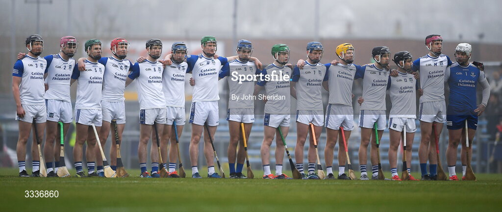 31 January 2026; The St Flannans College team line out for the national anthem before the Dr Harty Cup final match between St Flannans College and St Joseph's CBS at Zimmer Biomet Páirc Chíosóg in Ennis, Clare. Photo by John Sheridan/Sportsfile